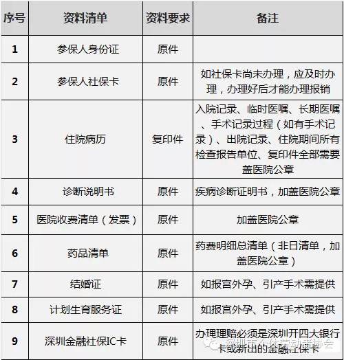 5、接下来,需要进一步录入信息。注意!带“*”星号的项目是必填项哦!6、紧接着,您需要设置个人登陆密码!密码必须是“长度为8--12位数字+大写字母+小写字母”的组合哦!7、恭喜你,注册成功!(如您注册失败,可致电与我们联系:82280002)8、然后,您回到第一步的页面,输入身份证号、密码、验证码,就可以登陆啦!10、在左侧可以看到菜单栏,您可根据需要查询具体内容。如果是在深圳社保局在市外的定点医院,可以直接根据当地医院结算,不需要拿回深圳报销;如果是在非深圳社保局市外定点医院,就得自行先支付医疗费用,然后在一年内把相关资料拿回深圳社保局申请报销。报销资料如图: