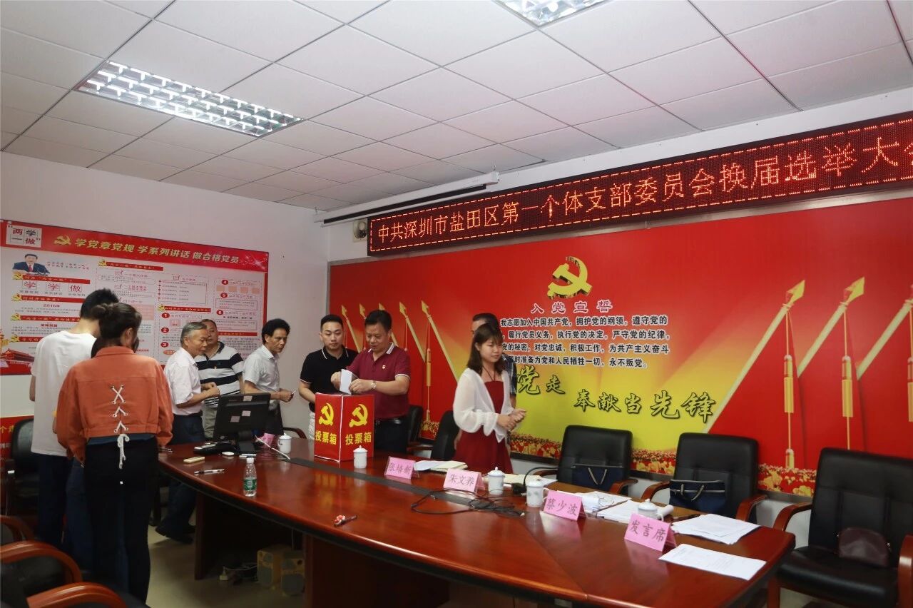 在庄严的国歌声中,换届选举大会拉开帷幕。朱文养宣读《中共深圳市个体私营企业协会委员会关于中共深圳市盐田区第一个体支部委员会换届选举的批复》。