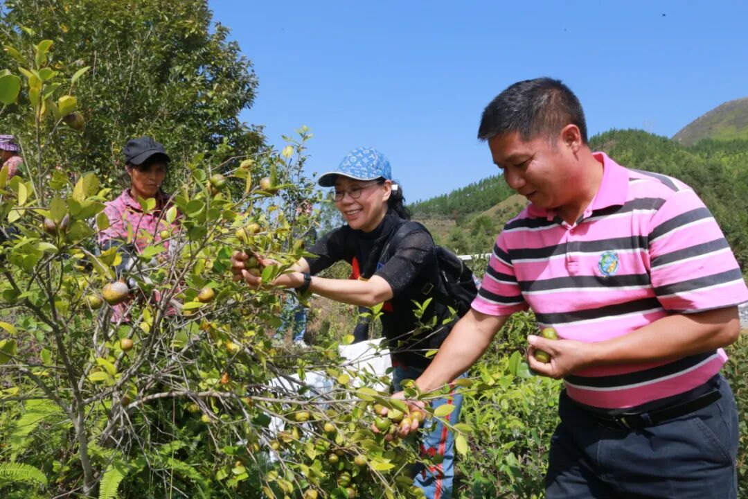 经过一番跋涉,映入眼帘的是漫山遍野的成熟油茶果,数十名村民正在热火朝天地采摘。据陈源仕介绍,油茶果的采摘期非常短,必须在每年霜降前后的十天内完成,时节一过,果实就会自然落果,造成浪费损失。他还说,由于今年的油茶果收成较好,加上种植面积较大,目前抢收工作压力非常大。感受到陈总的丰收喜悦,曾宏兴一行也纷纷主动加入到了采摘工作中。