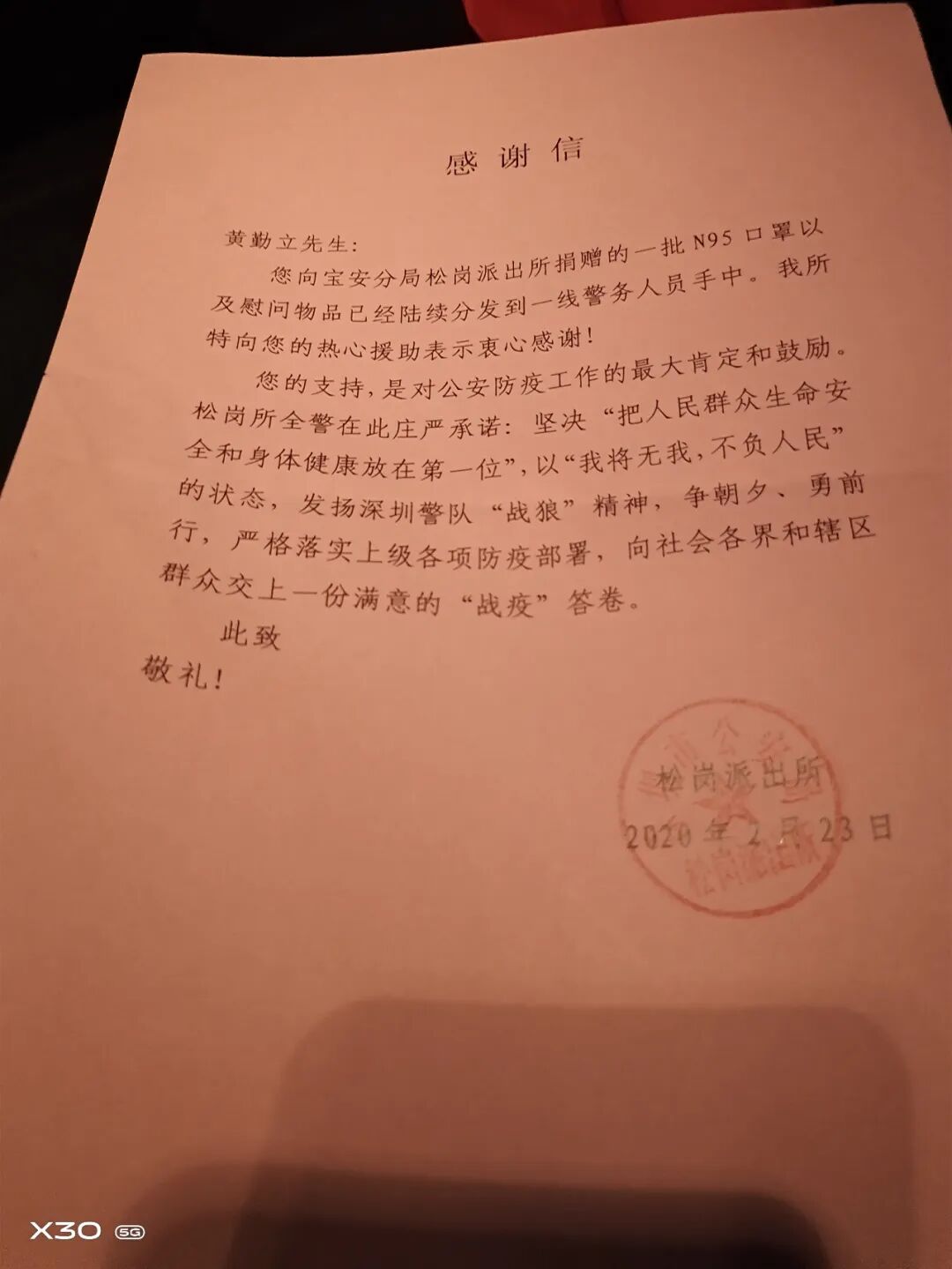 在得知当地政府要寻找酒店作为外地入深人员医学隔离点时,黄勤立主动说服酒店股东,为政府提供含有100多间客房的酒店作为隔离点,这意味着包括西餐厅在内的场所将暂时不能开业。对此,黄勤立坦然接受,他说,“支持抗击疫情工作,个人受点损失没什么,没有小家,哪来的大家,只有大家好起来了,我们的小家才能兴旺。”